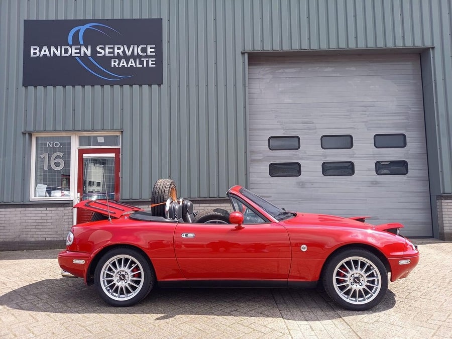De standaard velgen van de MX5 zijn 14 inch. We wilden voor het oog wel wat grotere velgen met bredere banden en deze waren 16 inch, met een dus minder hoge band (205x45x16). Dit om de goeie omtrek te houden die bij de auto paste.