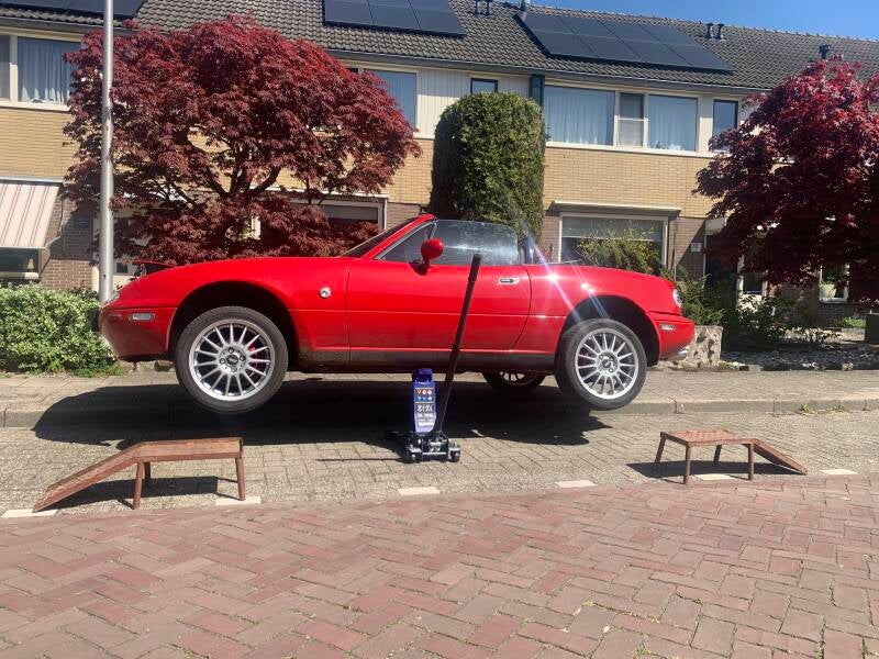 Goed gereedschap is ook hier het halve werk. Dit ook om veilig te kunnen werken. De ouderwetse oprijbokken (zijn voor de MX5 te hoog om er op te rijden) kan ik er nu in één hefbeweging zo onder de wielen schuiven. Moest met de oude krik altijd in twee keer, met behulp van houten blokken.